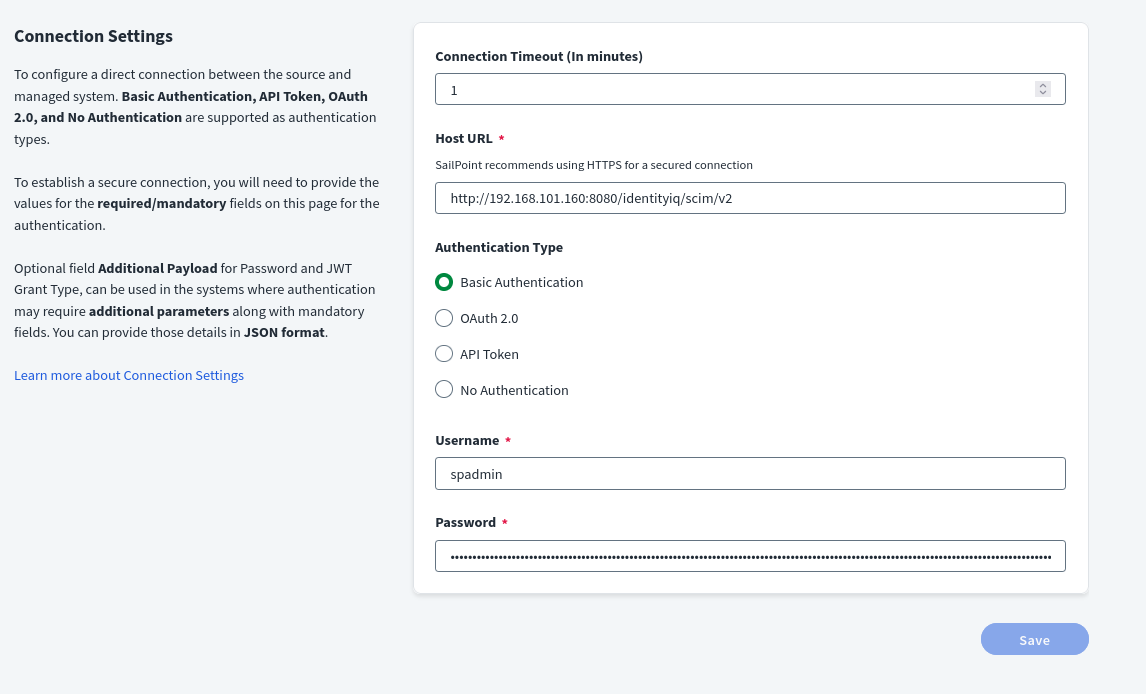 Now you can go back to the ‘Sources’ overview and create the SCIM 2.0 source. Under ‘Connection Settings’ you (for now) need to use Basic Authentication because oAuth 2.0 seems to give problems while aggregating (IIQ Logs say Bearer Token expired).