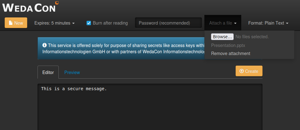 While PrivateBin provides a powerful open-source foundation, a default installation can lack the enterprise-ready polish and secure-by-default configuration necessary for corporate environments. At WedaCon, we bridge this gap by transforming this versatile tool into Secretshare, a hardened and customized solution tailored to your organization’s security policies and brand identity.