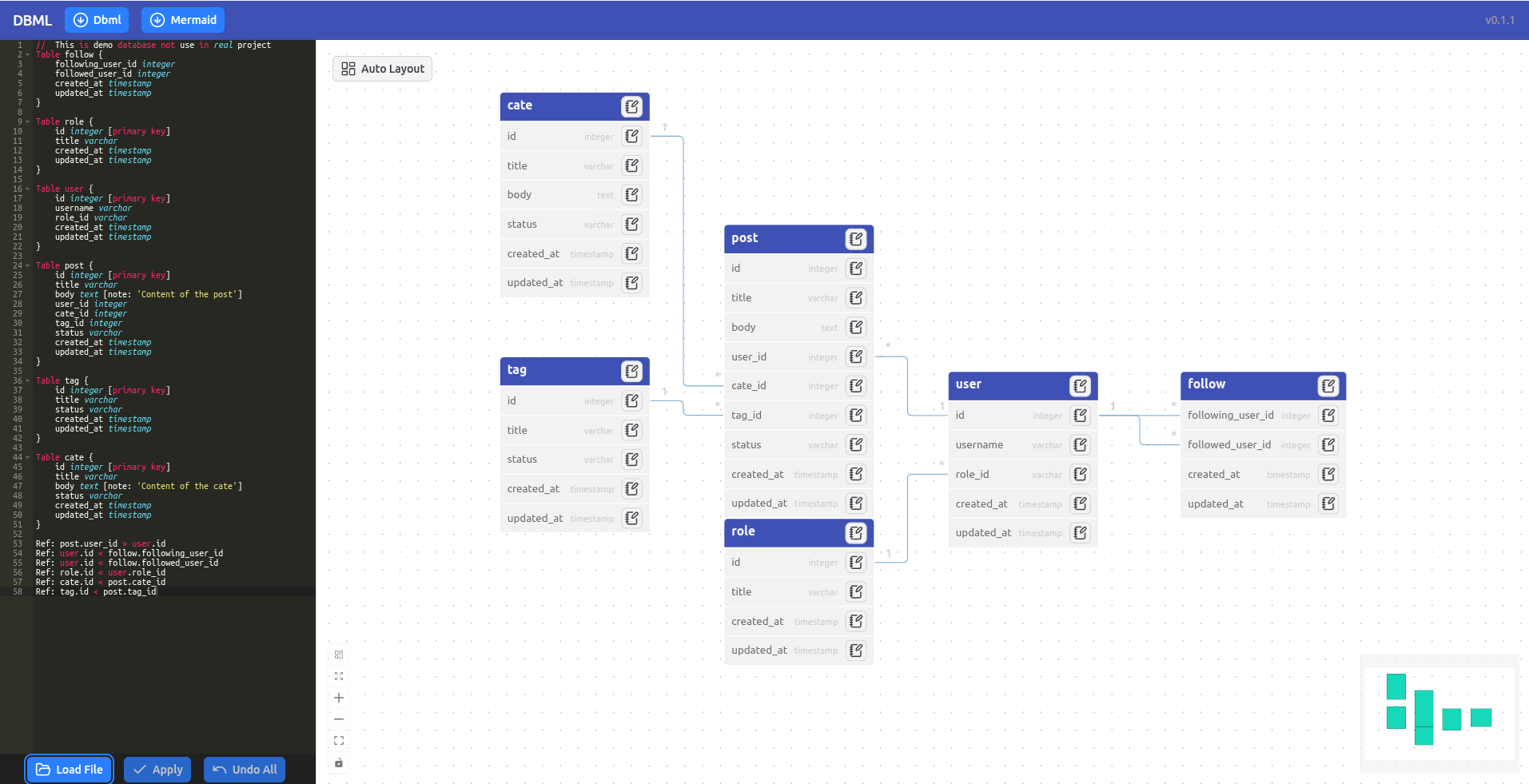 - Mermaid.js Export: Convert DBML files into Mermaid diagrams for documentation or presentations.